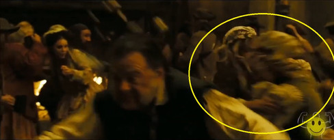 I never thought I'd get tired just sitting on the floor playing around with different materials, but after 20 minutes of viciously rustling a heavy piece of material in front of a microphone, I realised how physically demanding some foley work can be. Trying to match the intensity of the fights in the scenes to make sure the cloth I was rustling around sounded like all of their clothes was a lot more demanding than I thought, although it was fun. I found that watching particular sections of foreground fighting on repeat while I was working with the materials was the best way to try and match every movement with the right velocity and timing. We also found that going through the entire clip a few times just to get an underlying track of clothing movements was a good approach, only a few little adjustments in volume using automation were needed to make it fit. I found that I didn't really realise how much of this kind of background sound we would need until I watched through trying to find bits where it was needed. Below are still from only a couple of sections that required the sounds of clothes rustling during a struggle.